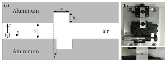 The proposed structure and a photograph of the fabricated waveguide are shown (depicted) in Figure 1, which is composed of a PPWG structure (Al plate, εm) with two rectangular stubs separated by an air gap S. The permittivity of Al is described with the Drude model. The length and height of the rectangular cavity are w and hy, respectively. The shift central points of the stubs overlap with small shift L. The length of the total waveguide is 5 mm. Terahertz radiation is polarized parallel to the plates to excite TE modes.