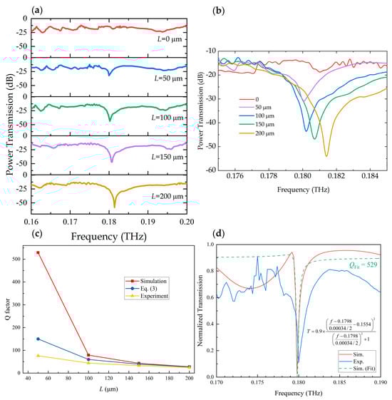 Figure 4a depicts the measured power transmission spectrum of a side-coupled waveguide with L = 0, 50, 100, 150, and 200 μm in the frequency band from 160 GHz to 200 GHz. The bottom plot provides a closer look at the low-frequency dips, as shown in Figure 4b. We can obtain the following results from the experimental data: (1) For L = 0, the Fano resonance cannot be excited due to the symmetry of the top and bottom stubs. (2) The Fano-like resonance evolves once the symmetry of the structure is broken along the x axis. (3) A further increase in the displacement of the two stubs from the center results in the reduction in the Q factor, as shown in Figure 4c. This is due to the increased asymmetry/shift between the top and bottom stubs. The experimental results fit the simulation results well. To illustrate the good agreement between experiment and simulation, we overlay the results of the simulation (Sim.) and experiment (Exp.) for L = 50 μm in Figure 4d for direct comparison. The figure shows that the experimental result agrees well with the simulation. The minor discrepancies are mainly attributed to fabrication and measurement tolerances. There are also some slight deviations, which are mainly caused by fabrication and measurement tolerances. The Q factors in Figure 4c,d are calculated by Q = f0/Δf, where f0 is the central frequency of the Fano resonance and Δf is its full width at half maxima. We use the Fano formula (Equation (4)) [38] to fit the Fano resonance peak and extracted Δf and f0 from the fitting parameters for the calculation of the Q value.