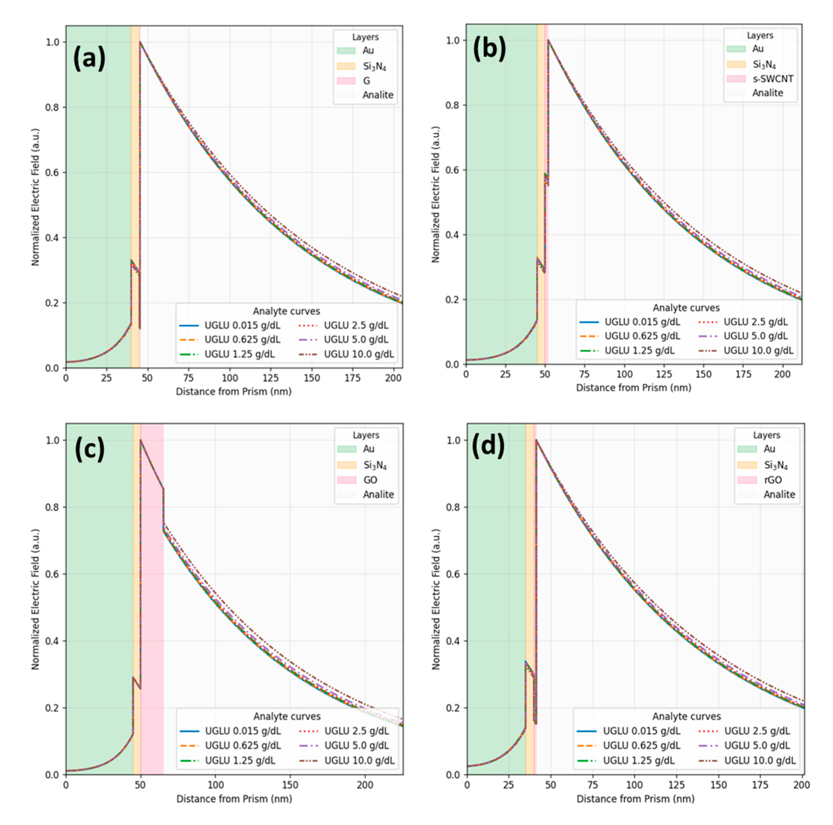- Shoshi, M.S.; Huraiya, M.A.; Raj, V.R.; Jawad, A.; Kong, C.Y.; Tabata, H.; Ramaraj, S.G.; Razzak, S.M.A. Revolutionary barium titanate–BlueP/TMDCs SPR sensor: Ultra-sensitive detection of urine glucose levels. Talanta Open 2025, 11, 100401. [Google Scholar] [CrossRef]