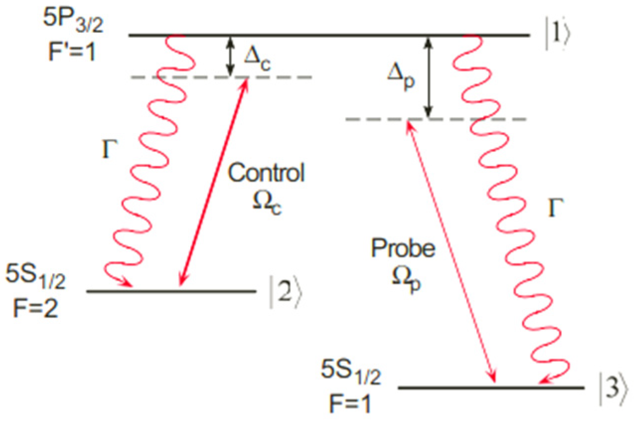 - Javan, A.; Kocharovskaya, O.; Lee, H.; Scully, M.O. Narrowing of electromagnetically induced transparency resonance in a Doppler-broadened medium. Phys. Rev. A 2002, 66, 013805. [Google Scholar] [CrossRef]