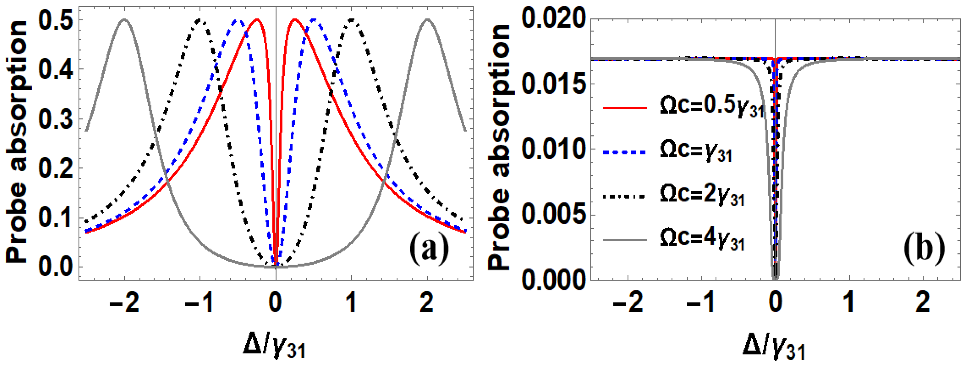 - Pack, M.V.; Camacho, R.M.; Howell, J.C. Electromagnetically induced transparency line shapes for large probe fields and optically thick media. Phys. Rev. A 2007, 76, 013801. [Google Scholar] [CrossRef]