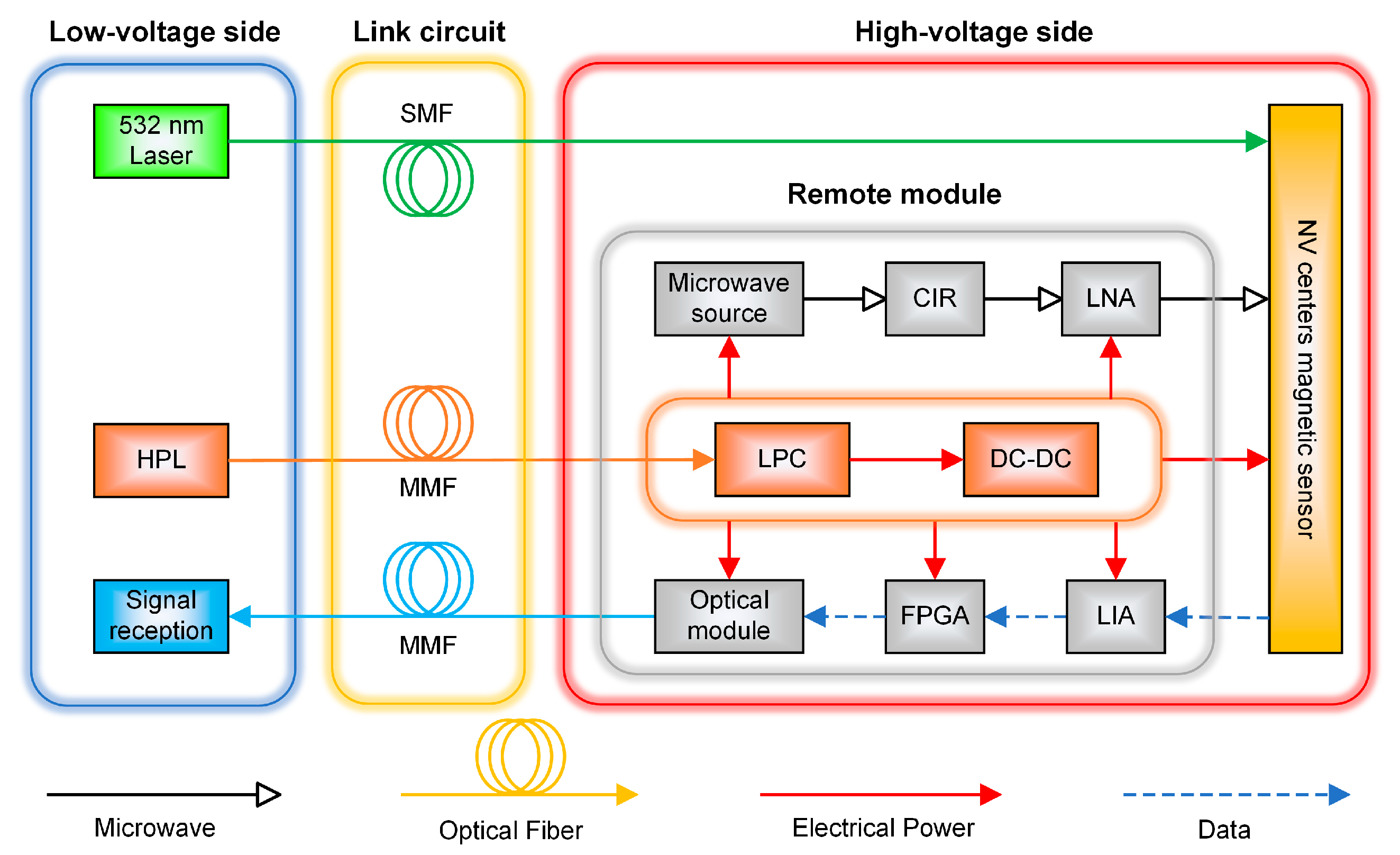 Zhan, L.; Guan, C.; Dong, C.; Fan, X.; Guo, Q.; Wang, W.; Xiao, Y.; Chen, X.; Huang, J.; Zhang, X.; et al. Ultra-High Voltage NV Center Magnetic Sensing System Based on Power over Fiber. Photonics 2025, 12, 1093. https://doi.org/10.3390/photonics12111093