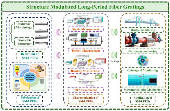 Structure-Modulated Long-Period Fiber Gratings (SM-LPFGs) represent an advancement in fiber optic sensor technology, moving beyond traditional photosensitivity-based fabrication to achieve enhanced performance through the direct physical modification of the geometry of the fiber. This review provides a comprehensive analysis of the primary fabrication techniques enabling this approach, including CO2 laser inscription, femtosecond laser micromachining, electric-arc discharge, chemical etching, and fusion tapering. The central focus of this work is the elucidation of the definitive structure–performance relationship, systematically detailing how engineered geometries such as helical profiles, micro-tapers, and asymmetric grooves unlock novel sensing capabilities. We demonstrate how these specific structures are strategically designed to induce circular birefringence for torsion measurement, enhance evanescent field interaction for ultra-sensitive refractive index detection, and create localized stress concentrations for high-resolution strain and vector bending sensing. Furthermore, the review surveys the practical implementation of these sensors in critical application domains, including structural health monitoring, biomedical diagnostics, and environmental sensing. Finally, we conclude by summarizing key achievements and identifying promising future research directions, such as the development of hybrid fabrication processes, the integration of machine learning for advanced signal demodulation, and the path towards industrial-scale production.