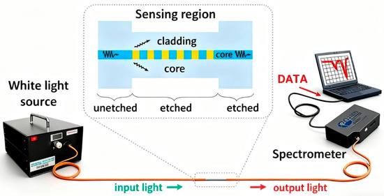 The is the resonant wavelength, and are the effective refractive indices of the fundamental core mode and the cladding mode [8], respectively, and is the grating period. As light propagates through the fiber core, the specific wavelength that satisfies this phase-matching condition is coupled into a co-propagating cladding mode [13,20]. The sensing principle of an LPFG is intrinsically linked to this relationship. Any change in external physical parameters—such as strain, bending, torsion, surrounding refractive index, or temperature—will modulate the effective refractive indices of the core and cladding modes. This, in turn, alters the index difference, , thereby shifting the resonant wavelength . By establishing a quantitative relationship between the magnitude of this wavelength shift and the change in the measurand, precise measurement is achieved.
