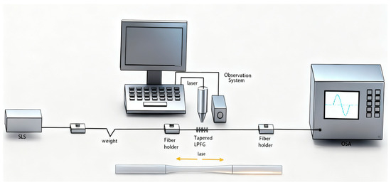 The aforementioned techniques function by inducing pronounced structural modifications—typically physical disruption or diameter reduction—to directly inscribe the grating [48]. In stark contrast, other approaches either impart a more subtle effect on the cladding or, like uniform fusion tapering (such as Figure 6), are in their elemental form incapable of forming an LPFG independently [49]. They must therefore be synergistically combined with embedded structures or other modulatory forms to realize an SM-LPFG [50].