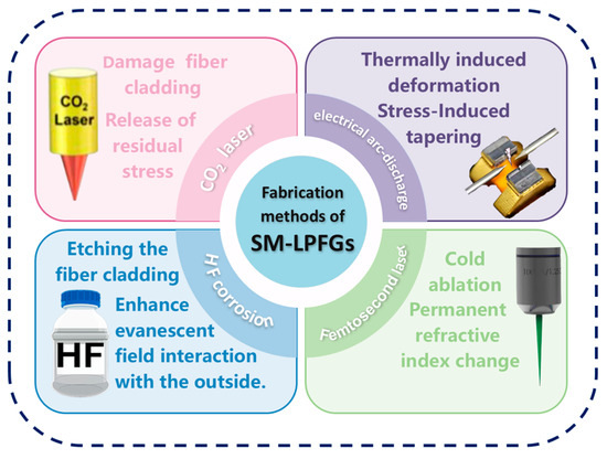 The field of SM-LPFG fabrication is progressively advancing toward the integration of multiple technologies and the adoption of intelligent manufacturing paradigms. To this end, researchers have already begun to integrate these fabrication methods. For instance, combining the precision pre-processing capabilities of femtosecond lasers with subsequent selective HF etching, or applying arc-discharge as a post-processing step to gratings initially inscribed by CO2 lasers, have both been demonstrated to yield substantial enhancements in sensor sensitivity. Dual-parameter SM-LPFGs sensitive to different parameters can be fabricated. The advantages and disadvantages of different preparation methods for SM-LPFGs are summarized, as illustrated in Figure 7, and the types of LPFGs suitable for fabrication by each preparation method are further elaborated on, with comparisons presented in Table 1.