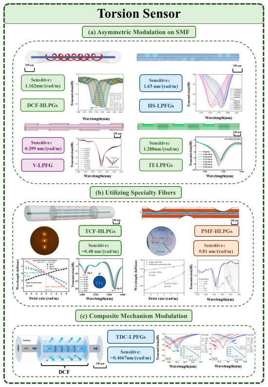 Torsion sensor: Torsion-sensitive SM-LPFGs rely on introducing structural anisotropy through three primary strategies: (a) the direct inscription of chiral structures and helical gratings, onto an SMF to translate torsional strain into a spectral shift; (b) leveraging specialty fibers such as multi-core fibers that possess inherent non-centrosymmetric core arrangements; and (c) exploiting unique physical mechanisms, such as modulating evanescent field interactions in double-clad fibers, to achieve highly sensitive responses.