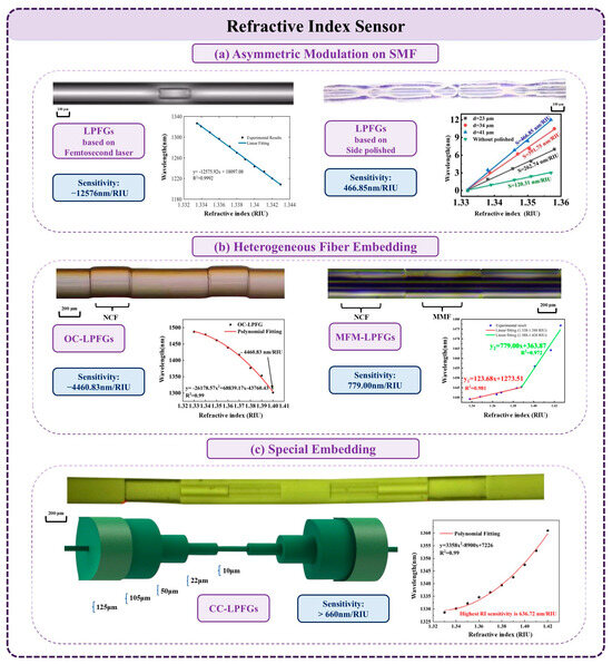 To push the sensitivity limits even further, researchers are combining embedded designs with other structural enhancement techniques. In 2023, Liu et al. [32] proposed a tapered two-mode fiber embedded LPFGs (TTMF-LPFGs). The device was fabricated by alternately splicing 50 µm segments of TMF and SMF to form a four-period structure, which was then tapered to a waist diameter of 36 µm. This configuration leverages a three-fold synergistic effect: the tapered region enhances evanescent field penetration, tapering-induced redistribution excites higher-order cladding modes, and periodic diameter modulation arises from differential thermal expansion during the process. This combination boosted the RI sensitivity to 1360.43 nm/RIU while maintaining low temperature crosstalk. Also in 2023, Tian et al. [89] innovatively applied an offset splicing technique when embedding a hollow-core fiber into an SMF. The resulting structural asymmetry dramatically increased the coupling efficiency between core and cladding modes, catapulting the sensitivity to an impressive −4460.83 nm/RIU. Furthermore, capitalizing on the unique modal properties of few-mode fiber (FMF) has proven effective. Zhang et al. [90] developed an MMF-embedded structure LPFGs (MFM-LPFGs) where the core mismatch between a multimode fiber and the FMF induces strong RI modulation. This sensor achieved a high RI sensitivity of 779.00 nm/RIU alongside exceptionally low cross-sensitivities to temperature and strain, highlighting its potential for use in complex environments. In summary, embedded SM-LPFGs, particularly those incorporating NCF or tapered sections, achieve sensitivities far exceeding conventional LPFGs by either expanding the optical field for greater external interaction or by efficiently exciting higher-order cladding modes, providing a versatile platform for developing customized RI sensors that combine high sensitivity with excellent stability.