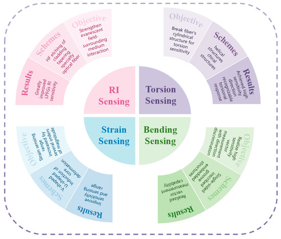 In essence, conventional LPFGs are inherently insensitive to torsion due to their symmetry. SM-LPFGs significantly improves the performance of the sensor through structural modulation, as shown in Figure 9. The development of SM-LPFGs, which introduce engineered asymmetries like helical grooves, provides an effective strategy to overcome this limitation by dramatically enhancing sensitivity and strategically managing stress. Specific examples are shown in Table 3. Despite their performance advantages, the cost and fabrication complexity of specialty fibers favor SMF-based platforms for scalable applications. Future research directions include optimizing structural designs for greater coupling efficiency and reproducibility, alongside exploring material enhancements, such as doping, to improve mechanical robustness. Progress in these areas is crucial for unlocking the full potential of SM-LPFGs in demanding fields like structural health monitoring [84], intelligent robotics, and renewable energy systems.