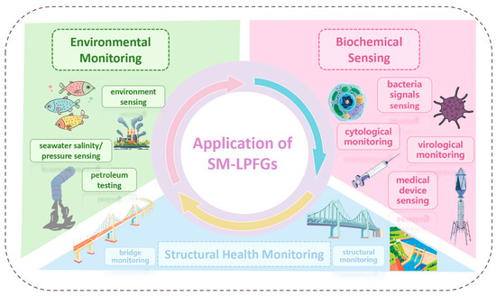 To provide a systematic overview of the research landscape for SM-LPFGs and to chart its future course, this review is structured into four main sections, as illustrated in Figure 1. The review commences with a systematic examination of the four principal fabrication techniques for SM-LPFGs: CO2 laser inscription, electric-arc discharge, chemical etching and femtosecond laser micromachining. We will conduct a thorough analysis of each method, evaluating their underlying principles for inducing physical deformation in the optical fiber, as well as their respective advantages and inherent limitations. Building upon this foundation, the discussion pivots to the four principal sensing applications: strain, torsion, bending, and refractive index. In this core section, we critically analyze how distinct physical modulations—such as D-shaped side-polishing, V-grooving, helical micro-channels, and induced core-distortion—are engineered to enhance sensing performance. A comparative analysis of various SM-LPFGs is presented, with a focus on key performance metrics including sensitivity, measurement range, and immunity to cross-sensitivity, thereby elucidating the causal link between specific structural modifications and the observed performance gains. We will further explore the nuanced relationship between specific structural designs and sensing characteristics, detailing the relative merits of different fiber types in strain and bending sensing applications and the physical principles that govern their behavior. Subsequently, the review will survey the burgeoning applications of these high-performance SM-LPFG sensors, showcasing their potential and highlighting recent advancements in critical domains such as structural health monitoring, biomedical sensing, and environmental monitoring [18,19]. Finally, this review provides a critical assessment of the current landscape and future development direction of SM-LPFGs.