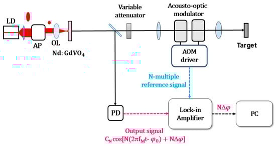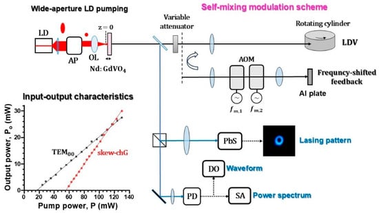 The harmonics-assisted phase amplification was examined in two ways. One was self-mixing laser Doppler velocimetry by focusing the output beam onto a rotating Al cylinder by a 15 cm focal-length lens placed 30 cm apart from the laser and the cylinder surface, where the laser was modulated at the Doppler-shift frequency, fM = fD = 2v/ (v: velocity along the laser axis). The other mixing modulation was performed using a pair of PbMoO4 acoustic-optic modulators (AOMs; center frequency = 80 MHz) whose self-mixing modulation frequency is given by fM = 2(fm,1−fm,2) depicted in Figure 1.