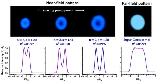 Near- and far-field lasing patterns were measured using a PbS photo-conductive image sensor (Hamamatsu Photonics, C1000, Tokyo, Japan) followed by a TV monitor and an intensity profiler. Typical results are shown in Figure 2 with increasing the pump power for a wide-aperture pumping of wp = 70 µm.