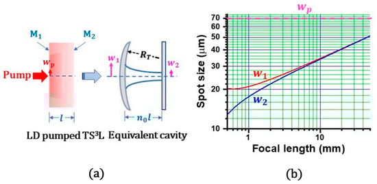 Here, l is the effective thickness of the thermally induced lens, while A is the heat-generated per unit volume and time, KT is the thermal conductivity, dn/dT is the thermal-optic coefficient of the refractive index, a is the coefficient of thermal expansion, and n0 is the refractive index of Nd:GdVO4. Here, since A increased as the pump power increased, the focal length was considered to decrease and the lasing beam spot size decreased accordingly.