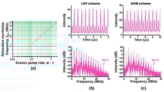 In this section, we address the key issue in the nonlinear dynamics of such modified skew-chG mode lasers subjected to self-mixing interference modulations by employing two methods, self-mixing laser Doppler velocimetry and frequency-shifted feedback using acousto-optic modulators, as shown in Figure 1. Here, self-mixing interference metrology works through the intensity modulation effect of a laser due to interference between the lasing and feedback fields. In short, the self-mixing laser acts both as a mixer–oscillator and highly sensitive detector of the signal from the target. The resultant optical sensitivity has been shown to be enhanced in proportion to the fluorescence-to-photon lifetime ratio, K = τ/τp, which reaches an order of 105–106 in state-of-the art TS3Ls. The photon lifetime in the present Nd:GdVO4 laser was determined by measuring the dependence of the relaxation oscillation on the excess pump rate: fRO = (1/2π), w = P/Pth, as shown in Figure 6a. Assuming τ = 90 μs, τp of 20 ps was attained, yielding K = 4.5 × 106.