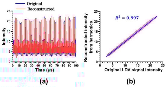 (a) Original and reconstructed self-mixing LDV signals. (b) Correlation plots indicating R2 = 0.997.