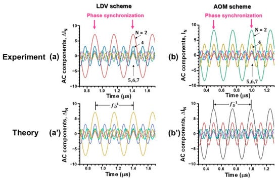 (a,b) Example harmonic waves for LDV and AOM self-mixing schemes, which were obtained experimentally. Theoretical harmonic waves, assuming Δ= 1.601 for (a’) and 1.505 for (b’).