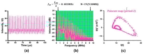 We performed experiments at fM = fRO/2 = 0.483 MHz by decreasing the pump power to P = 62 mW. Results are shown in Figure 9, featuring (a) period-2 waveform, (b) corresponding power spectrum and (c) Poincare map. The phase synchronization up to N = 19 was achieved with SNR 5 dB at 9.18 MHz.