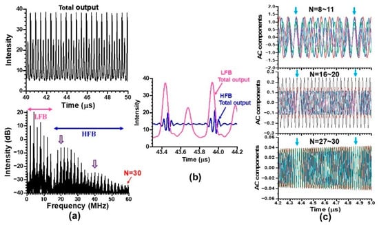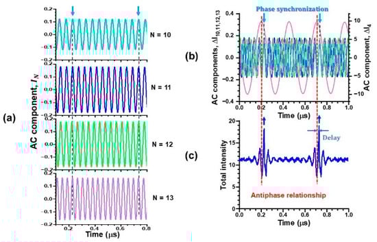Next, we examined the phase relationships among coexisting periodic waveforms of different harmonics within the lower- and higher-frequency bands in detail. The phases of the N-th harmonic waves in the higher-frequency band shown in Figure 11a are synchronized as well, obeying Equation (7). Meanwhile, harmonics belonging to the higher-frequency band exhibited antiphase dynamics against harmonics in the lower-frequency band, as shown by red dashed lines in Figure 11b,c, which parallel the middle inset of Figure 10b, where only the fundamental wave at 2 MHz in the low-frequency band is shown by red waveform for brevity.