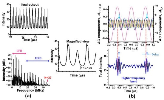 After quite a short time delay depicted in Figure 11b, the phase synchronization is established among harmonic waves in the higher-frequency band as indicated by the light blue arrows in the same way as Figure 10b. In other words, the gain transfer from the lower to the higher frequency band corresponding to the intensity transfer, as depicted by the blue arrows at the bottom of Figure 10b, triggers the phase synchronization among all the harmonics in the higher-frequency band after a slight time delay on the order of 1/(2ΔνB). Consequently, the harmonic waves in both frequency bands obey Equation (7) via a slight time delay indicating the subharmonic resonance of fM = ΔνB/12 in this case.
