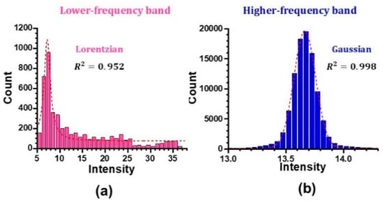 Finally, it is interesting to note that there is a non-trivial correlation between the histogram and power spectra in the present hybrid skew cosh Gauss mode laser system. Figure 16 shows the histograms (i.e., intensity probability distribution) of the output waveforms in the lower and higher frequency bands in the case of an intermediate feedback regime shown in Figure 10. They are fitted quite well by Lorentzian and Gaussian distributions, respectively, and exhibit a strong correlation with the power spectra shown in Figure 15b,c. The power spectral nature shown in Figure 15a with lateral-coupling resonance of coexisting transverse modes seems to play a crucial role in organizing collective dynamics.