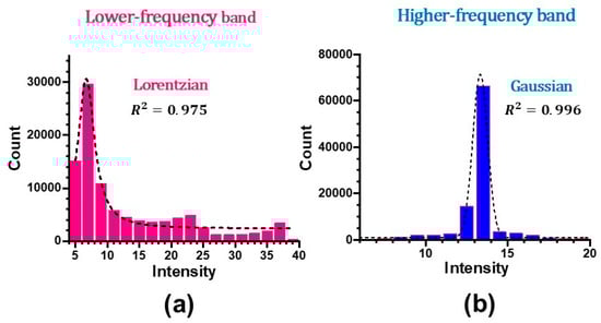The same histogram nature was also established for Figure 13 and Figure 14 in the strong feedback regime, i.e., Lorentzian for the lower-frequency band total intensity and Gaussian for the higher-frequency band total intensity as shown in Figure 17, which corresponds to Figure 13.