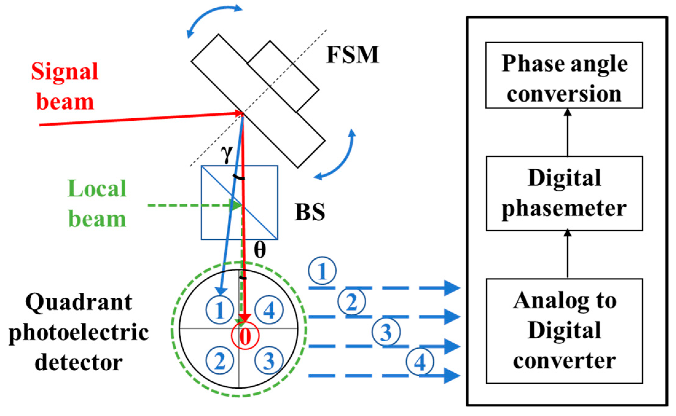 In this study, a scanning nutation coherent detection system is designed. After the signal beam to be measured is coupled into the system, it is reflected by a precision fast steering mirror, which simultaneously executes the nutation motion. Upon passing through a beam splitter (BS), the transmitted signal beam to be measured undergoes coherent mixing with the reflected collimated local beam. The generated beat frequency signal is projected onto the photosensitive surface of a QPD, producing four channels of photocurrent signals that contain amplitude and phase information. After the four-channel photocurrent signals are converted by an analog-to-digital converter (ADC), a digital phase meter extracts the phase information of each quadrant and then calculates the azimuth and pitch yaw angles. The system block diagram is shown in