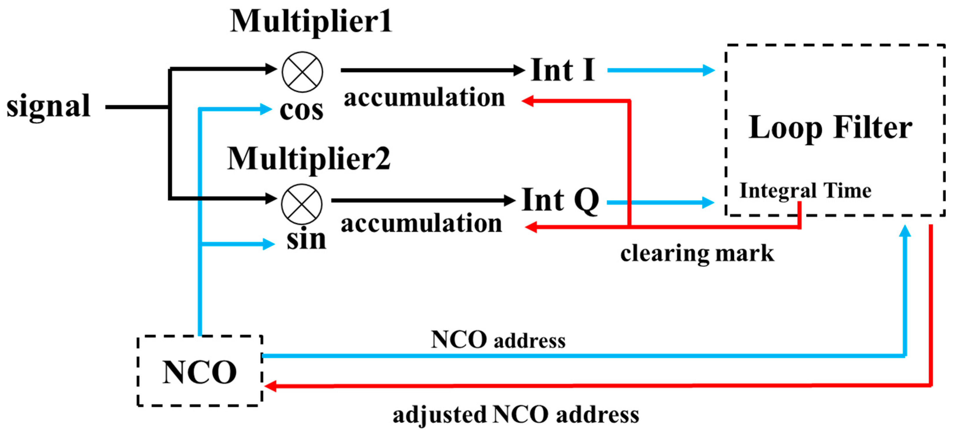 Here, fNCO,k and fNCO,k−1 represent the output frequencies of the numerically controlled oscillator (NCO) at the k-th and (k−1)-th discrete time instants, respectively. Kp is the proportional gain, which denotes the instantaneous response of phase error to frequency adjustment. Ki is the integral gain, representing the cumulative response coefficient of the error change rate to frequency adjustment; its core function is to eliminate the long-term steady-state error of the loop. Tcoh denotes the coherent integration time, a core time window in the phase error detection process, mainly used to accumulate the phase difference between the input signal and the local carrier. θe(k) is the phase error at the k-th time instant, representing the difference between the instantaneous phase of the beat frequency signal and the phase of the NCO carrier.