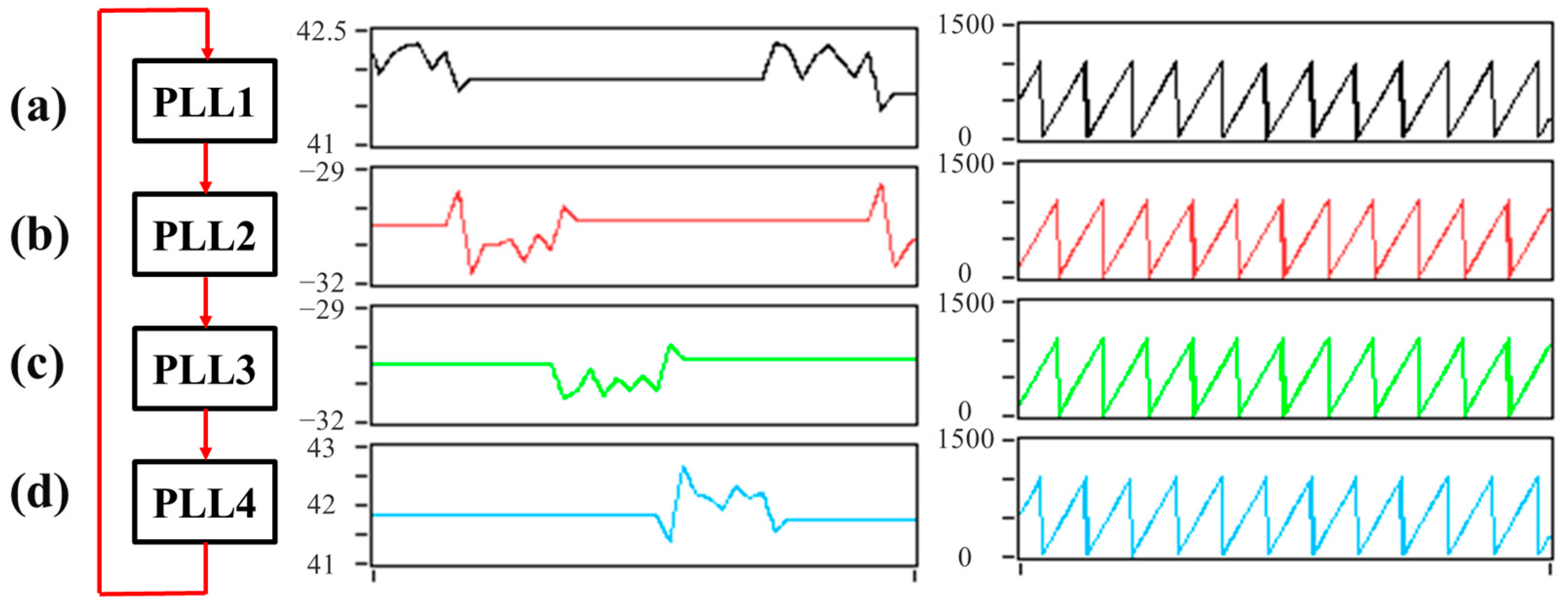 The PLL module in the angle measurement system operates continuously based on the aforementioned cyclic switching and parameter retention mechanism. By performing real-time comparison and analysis on the NCO address parameters of the 4 PLL channels, high-precision measurement of phase information at different nutation points is ultimately achieved. The NCO address offsets and NCO address variation characteristics during the operation of the 4 PLL channels are shown in
