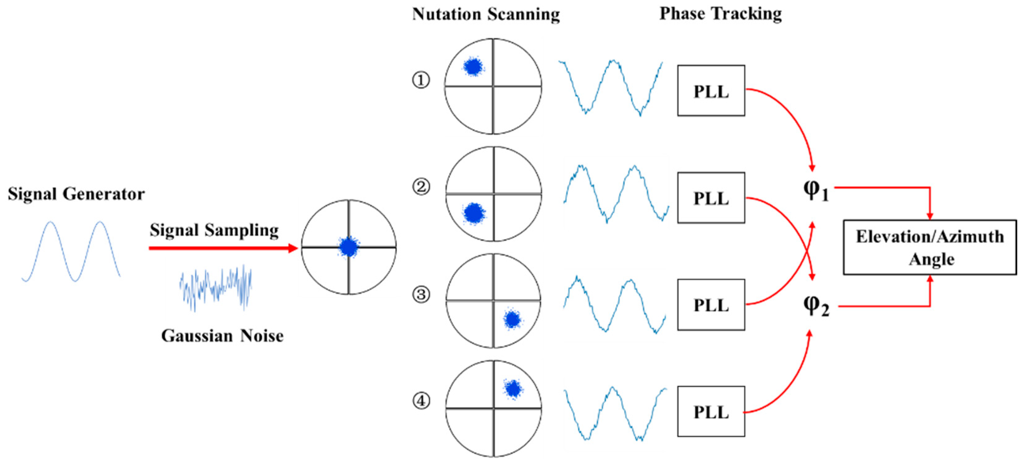 20]. The specific simulation implementation process is as follows: The simulation of the angle measurement system is divided into three phases, namely beat frequency signal generation, nutation scanning, and phase tracking. The block diagram of the simulation system is shown in