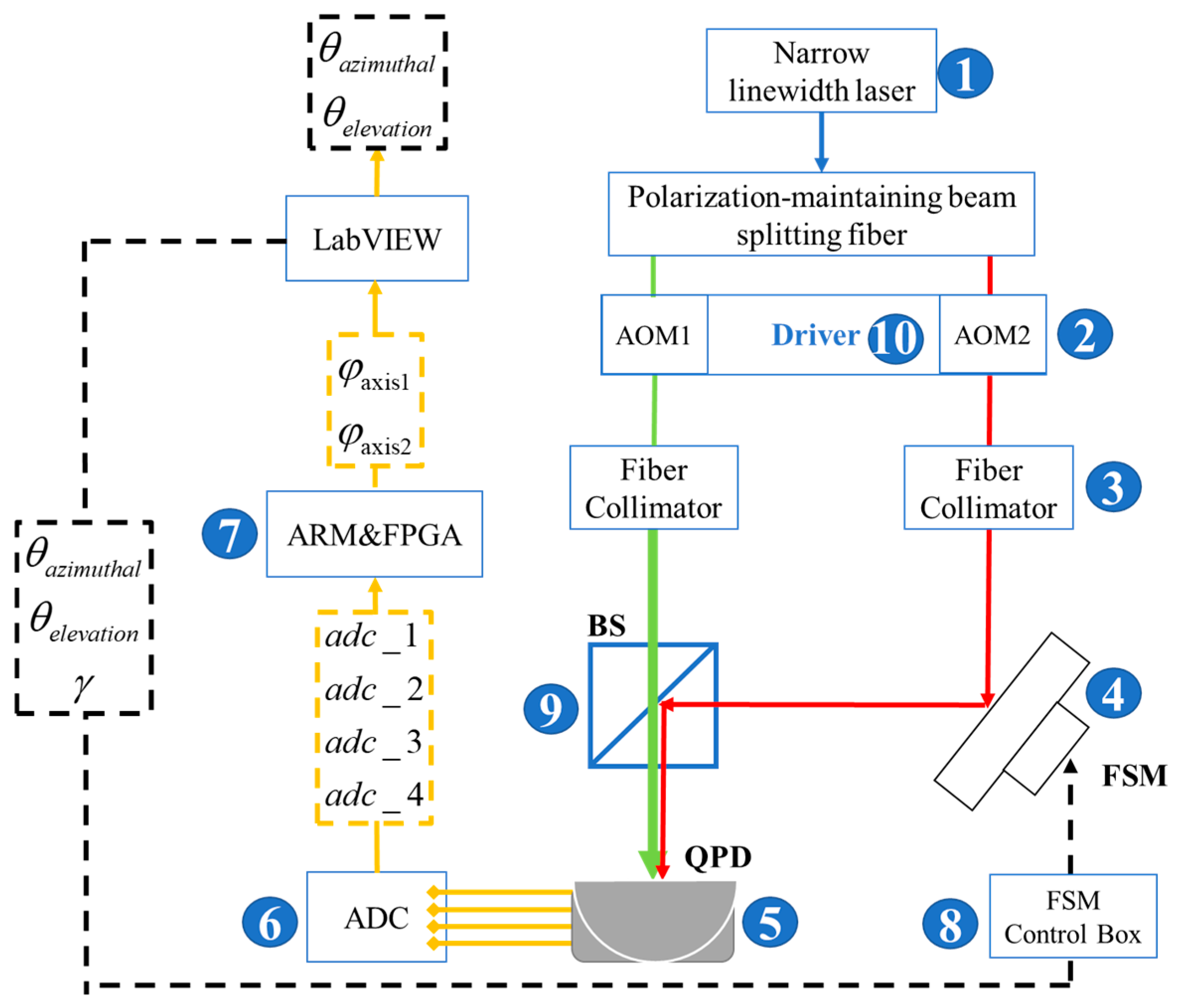 Figure 11. The light emitted by a narrow-linewidth laser is split into two paths by a polarization-maintaining fiber splitter: one path serves as the local beam, and the other as the signal beam. Each path undergoes frequency shifting via an acousto-optic modulator (AOM) and is then emitted into the spatial optical path through a fiber collimator. The local beam is transmitted through a BS and incident along a fixed optical path to the center of the photosensitive surface of the QPD. The signal beam, on the other hand, is reflected by a FSM for dynamic angle adjustment: according to the target angle miss distance and nutation scanning angle parameters configured by the upper computer, the FSM not only provides the target angle miss distance in real time but also drives the signal beam to complete the preset nutation scanning motion on this basis, thereby realizing the detection of target angle information. The QPD converts the received light intensity signal into an analog electrical signal, which is then subjected to high-precision digital sampling by an ADC. The sampled data are transmitted to an industrial control board equipped with dual cores—an advanced RISC machine (ARM) and a field programmable gate array (FPGA)—to perform high-speed phase-locked phase detection operations, extracting the phase difference information between the local beam and the signal beam. Finally, the control board uploads the phase difference data of the two nutation axes (azimuth axis and elevation axis) to the LabVIEW upper computer via serial communication. The upper computer completes the precise calculation of the azimuth angle and elevation angle and outputs the final angle measurement result. The desktop experimental framework and physical diagrams are shown in the figures below.