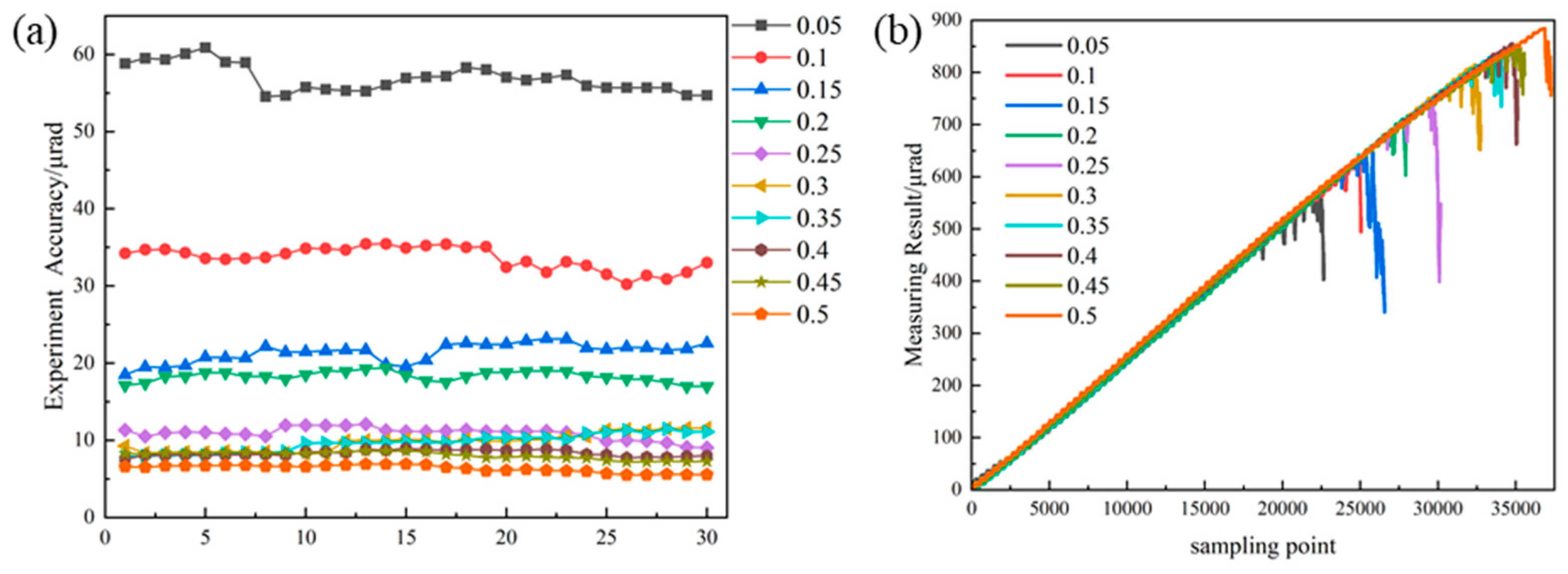 Figure 12a presents the angle measurement accuracy results obtained by performing repeated measurements on 30 statistical units under different baseline conditions; the final angle measurement accuracy of the experiment is determined by calculating the arithmetic mean of the multiple repeated measurement results. To clarify the system’s effective measurement range, the experiment gradually increases the yaw angle in steps of 10 μrad while simultaneously conducting measurement experiments at the corresponding angles, with the measurement results shown in