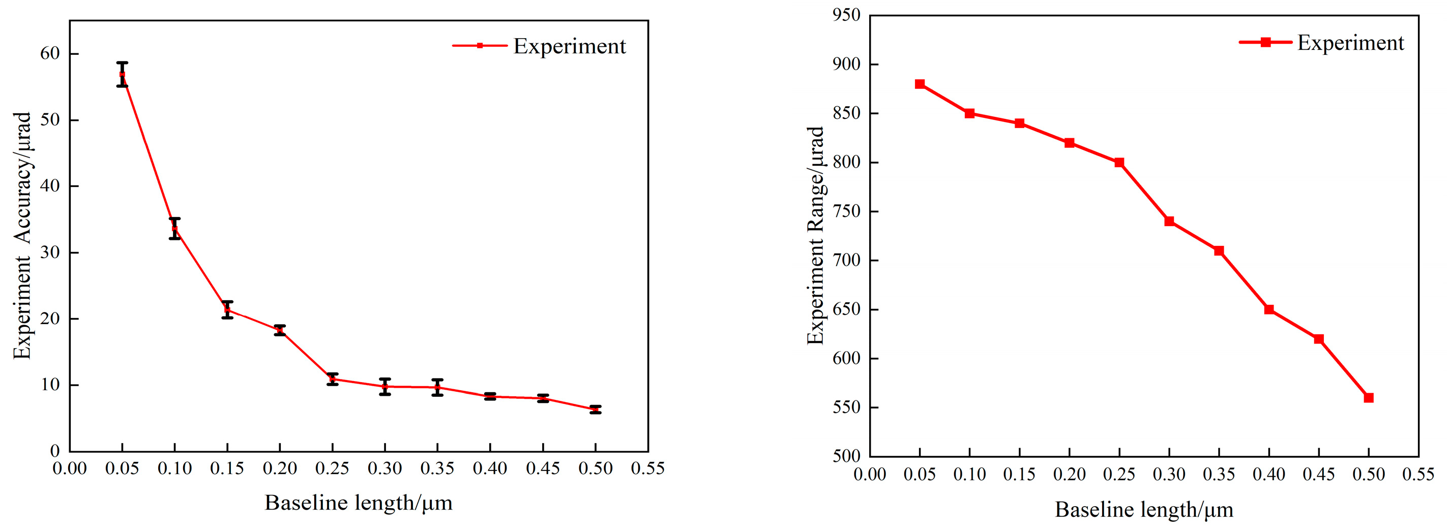 Figure 13. When the baseline length is set to 0.05 μm, the system’s angle measurement accuracy is 56.9 μrad; as the baseline length increases to 0.5 μm (corresponding to a nutation scanning angle of 100 μrad), the system’s angle measurement accuracy improves to 6.35 μrad, while the system’s effective detection range for the yaw angle decreases from 880 μrad to 560 μrad. Comprehensive analysis of the experimental results reveals that the baseline length of the angle measurement system exerts a regulatory effect on the measurement range and accuracy: a smaller nutation scanning angle leads to a shorter baseline length and a larger effective measurement range of the system; conversely, a larger nutation scanning angle results in a longer baseline length and better angle measurement accuracy of the system.