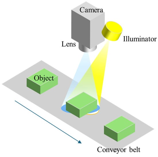 Schematic illustration of a typical machine vision system integrated with a conveyor belt. Objects are transported on the conveyor, illuminated by an external light source, and captured by a camera through an imaging lens.