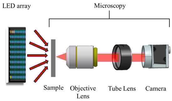 As mentioned in the previous section, FP is a computational imaging technique designed to simultaneously achieve the wide field of view (FOV) and high resolution of conventional microscopes. FP creates high-resolution images by capturing a series of low-resolution images from various illumination angles and synthesizing them to reconstruct a high-resolution image. FP uniquely combines two key optical technologies: synthetic aperture and phase retrieval [12]. The synthetic aperture principle was originally used in radio telescopes to combine images from multiple small telescopes to mimic a single, massive telescope [23]. FP similarly stitches together multiple low-resolution images acquired with illumination from various angles in Fourier space, creating a virtual, wider “synthetic NA” that overcomes the limitations of low-NA lenses. A typical FP system is configured as shown in Figure 2, in which the FP is similar to a conventional microscope setup, but with the addition of an LED illuminator with multiple light sources to capture a series of low-resolution images illuminated from various angles. The FP imaging process is based on the Fourier transformation and the shift theorem. When an object is illuminated with tilted plane wave illumination, the object’s Fourier spectrum shifts in Fourier space proportional to the angle of illumination. The lens itself performs the Fourier transform, and its finite numerical aperture (NA) acts as a low-pass filter, allowing low-frequency information to pass through in Fourier space. The FP sequentially acquires a series of low-resolution images using multiple angles of illumination, each containing spectral information located in a different region of Fourier space. The FP reconstruction algorithm synthesizes these scattered spectra into a single, high-resolution complex image through an iterative phase retrieval process.
