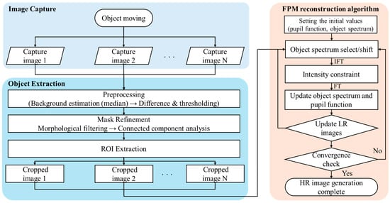 Workflow of FP based on moving objects for machine vision: A moving object generates multiple images. Preprocessing (background estimation, difference, morphology, and connected components) is performed to crop the region of interest (ROI) into a low-resolution object image. The final HR image of the object is reconstructed through iterative FP updates (spectral shift, IFT/FT, and intensity constraints).