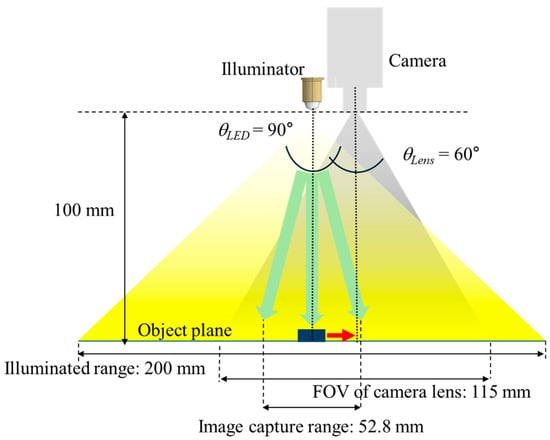 where p is the pixel size. In general, the fastest exposure time of a machine vision camera is approximately 1 μs, and referring to Table 1 and Table 2 summarized above, the pixel size of the camera used in the simulation and the magnification of the system are 2.74 μm and 0.0677, respectively. Considering this, can have a value of at least 20.24 mm/s. The speed of the conveyor belt that transports small electronic components such as PCBs or SMT varies greatly, but is generally known to be in the range of 8 mm/s to 100 mm/s. Therefore, it is expected that the proposed system can obtain sufficiently high-resolution images without significantly reducing the speed of the inline process.