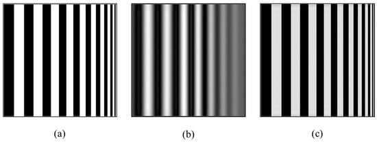 As mentioned above, the high-resolution image reconstruction simulation of FP proceeded only in one axis, which was the conveyor-belt transport direction. Therefore, the resolution improvement mainly affects the vertical lines in the transport direction, so a resolution chart image was created in the form of increasingly narrow vertical line spacing, as in Figure 8a, and this was used for system verification. When the image in Figure 8a is observed with a lens with an NA of 0.067 of the machine vision system, the vertical lines with high resolution, as in Figure 8b, are not distinguishable. However, when the resolution chart generated with a synthetic NA of 0.317 is restored to a high-resolution image by applying the FP algorithm, it can be confirmed that smaller lines can be observed compared to the image to which FP is not applied, as shown in Figure 8c.
