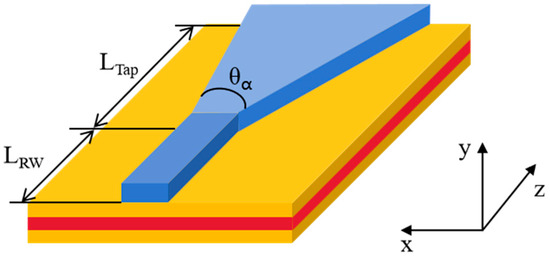 Schematic diagram of the tapered semiconductor laser structure. (The red part represents InGaAlAs active area, the yellow part represents InGaAlAs waveguide layer, AlInAs confinement layer and InP cap layer, and the blue part represents the current injection region).