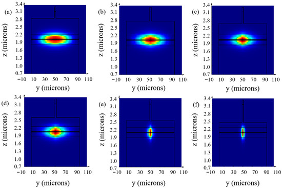 Optical field distributions in ridge waveguides with different etching depths: (a) 0.5 μm, (b) 0.6 μm, (c) 0.7 μm, (d) 0.8 μm, (e) 0.9 μm, (f) 1.0 μm.