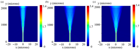 Figure 4 illustrates the optical field distribution under different taper angle conditions. As the taper angle increases, the area of the light-emitting surface gradually expands. In Figure 4a, the optical field is concentrated within a narrow central region, indicating high energy concentration with weak peripheral diffusion. The color bar shows that the high-intensity region occupies a small proportion, suggesting a small beam divergence angle and strong directivity. In Figure 4b, the optical field begins to expand laterally. The area of the central high-intensity region increases, and a distinct transition zone emerges around the periphery. This indicates that the beam starts to diverge yet still maintains relatively strong central energy concentration. In Figure 4c, the optical field distribution broadens significantly. The high-intensity region spreads further, as reflected by the increased proportion of red in the color bar and the expansion of the low-intensity peripheral area. This implies an increase in the beam divergence angle and a more dispersed energy distribution. As the taper angle increases, the confinement capability of the laser’s waveguide structure weakens, leading to the expansion of transverse modes—consistent with the geometric amplification effect of the tapered structure. A smaller taper angle (e.g., 4°) enhances transverse confinement in the tapered waveguide, resulting in a more concentrated optical field. In contrast, a larger taper angle (e.g., 8°) reduces the waveguide’s constraint on higher-order modes, leading to multi-mode oscillation and energy spreading.