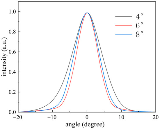 Figure 5 shows the far-field characteristics at taper angles of 4°, 6°, and 8°, respectively. As can be seen from the figure, all three curves exhibit a single-lobed distribution near 0°, indicating that the laser energy is concentrated in the forward emission direction, which is consistent with the typical far-field characteristics of lasers. When the taper angle is 6°, the waveguide structure provides stronger transverse confinement of the optical field, resulting in a small beam divergence angle with energy concentrated in the forward direction (near 0°), forming a narrow and high bell-shaped curve. In contrast, at taper angles of 4° and 8°, the lateral confinement of the waveguide is weakened, leading to broadening of transverse modes during propagation and enhanced diffraction effects. This causes the energy to spread over larger angles, manifesting as a broader curve with elevated intensity at the edges. Furthermore, variations in the taper angle may excite higher-order modes, further broadening the far-field distribution. Therefore, the optimal taper angle is 6°.