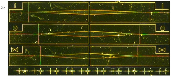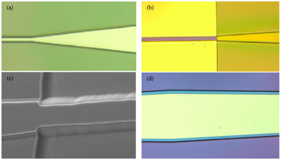 The fabrication process of the tapered laser included ultraviolet lithography, wet etching, magnetron sputtering of a SiO2 insulating film, metal electrode preparation, and die packaging. Figure 6 shows the effect diagrams during the fabrication process of five tapered semiconductor laser devices. After the completion of the fabrication process, the following tests were presented.