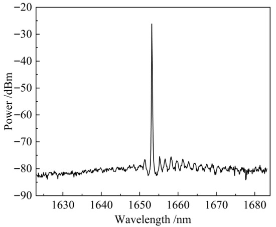 To characterize the emission properties of the device, the output spectrum of the semiconductor laser under continuous-wave (CW) operation was measured using an optical spectrum analyzer (OSA) with a resolution set to 0.1 nm. The measurement was conducted at room temperature, with a scanning range from 1623.16 nm to 1683.16 nm. The results, as shown in Figure 7, demonstrate excellent spectral performance of the semiconductor laser. The dominant lasing peak is located at 1653 nm with a peak power of −26.1 dBm. Most notably, the side-mode suppression ratio (SMSR) reaches 49 dB, indicating outstanding mode selectivity and high single-mode purity. Furthermore, the spectral width at −20 dB is 0.793 nm, reflecting a sharp spectral line and narrow-linewidth characteristics.