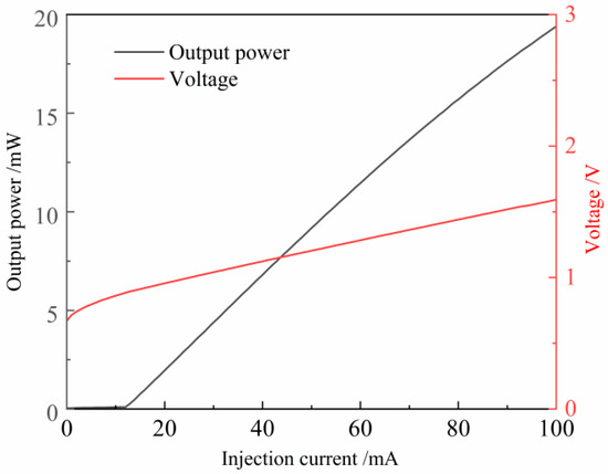 After the laser chip was fabricated and packaged, the output performance of the device was tested and analyzed at a controlled temperature of 25 °C. Figure 8 shows the power-current-voltage (P-I-V) characteristic curve of the tapered semiconductor laser. From the test data, the threshold current of the semiconductor laser is determined to be approximately 16.5 mA. When the injection current exceeds the threshold current, the gain generated within the semiconductor laser compensates for the various losses in the laser cavity, resulting in net amplification of photons and enabling the laser to operate in a stimulated emission state, thereby producing laser radiation. At an injection current of 99.8 mA, the maximum output power reaches 19.3 mW, with no significant thermal saturation observed.