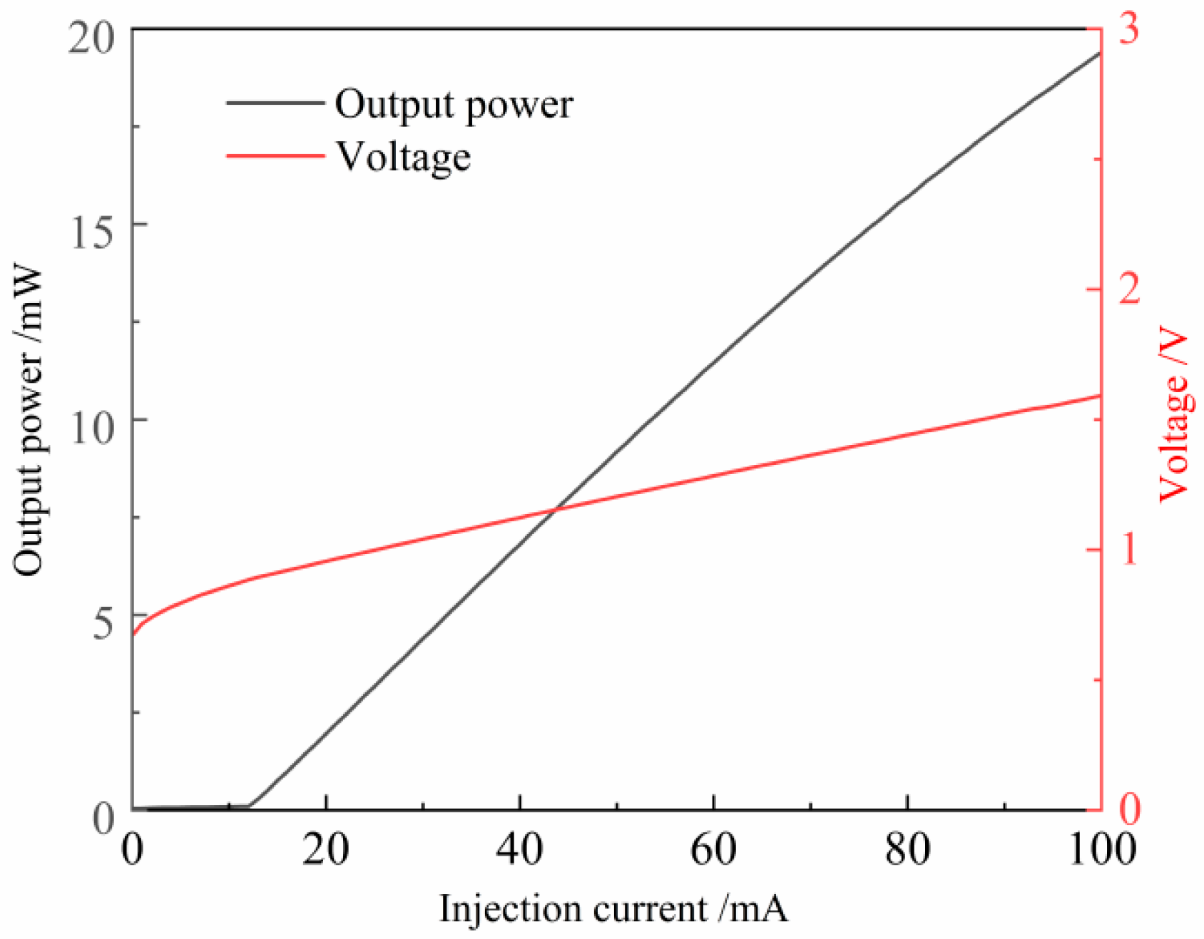 After the laser chip was fabricated and packaged, the output performance of the device was tested and analyzed at a controlled temperature of 25 °C.