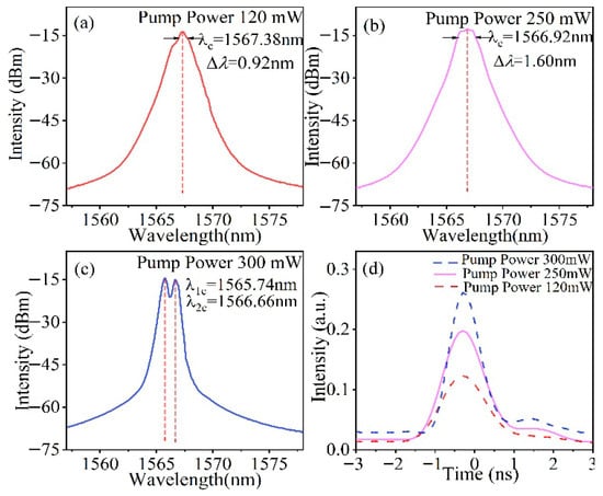 Remarkably, at the elevated pump power of 300 mW, two prominent spectral lobes emerge, centered at 1565.68 nm and 1566.64 nm. The occurrence of the M-shaped spectrum induced by the increased pump power can be ascribed to the enhanced absorption processes in the erbium-doped fiber, leading to a decrease in gain at the center of the spectrum, while higher gain can still be obtained on both sides, so the cavity filtering effects was enhanced and the M-shaped spectral is induced. Furthermore, the specific output wavelengths are dependent on the length of the gain fibers, the cavity configuration, the pump power, and the pump wavelengths []. Figure 5d shows the variation in pulse shapes at different pump powers. Increasing nonlinearity induced by the increase in the pump power keeps the temporal pulse profile with higher peaks. Meanwhile, the temporal pulse widths slightly decrease with the increased nonlinearity, agreeing well with the previous work [].