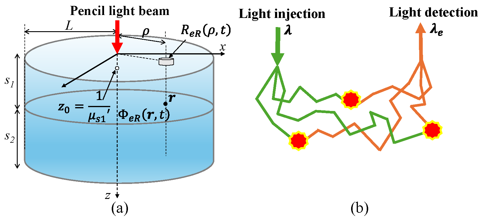 From now on, the quantities without a suffix are related to , and the quantities with suffix “e” refer to . A two-layer cylinder (see Figure 1a) of radius L and thicknesses and is considered for the first and second layer, respectively. At , we identify the absorption coefficients and ; the reduced scattering coefficients and ; the Raman scattering coefficients and ; and the refractive indices and in the first and second layer, respectively. Similarly, the symbols , , , , , and indicate the optical properties at .