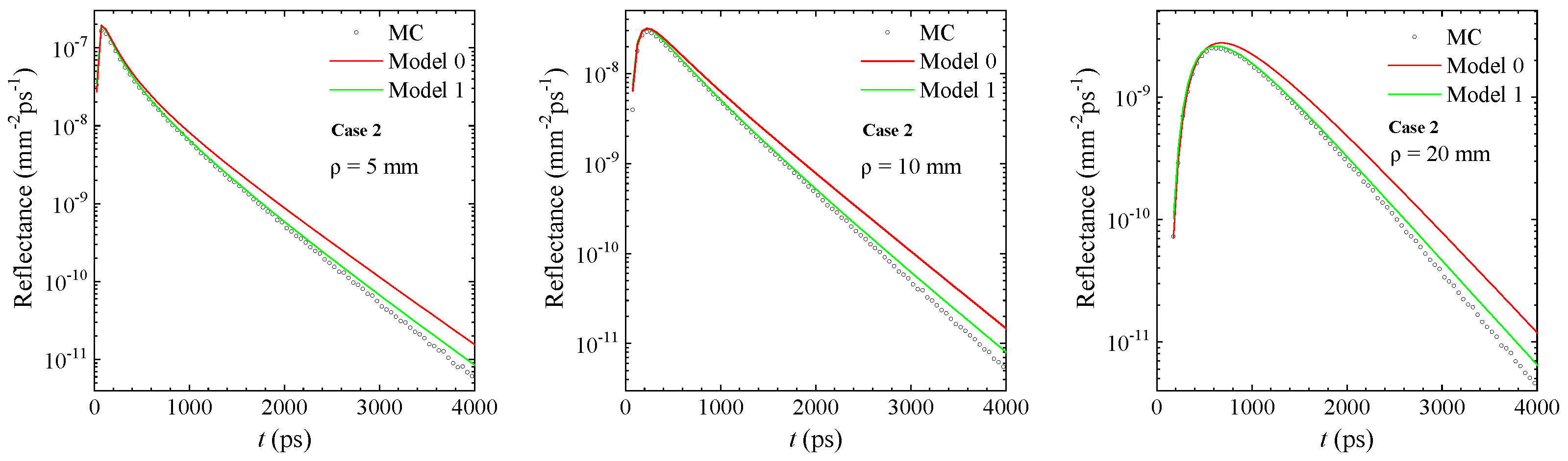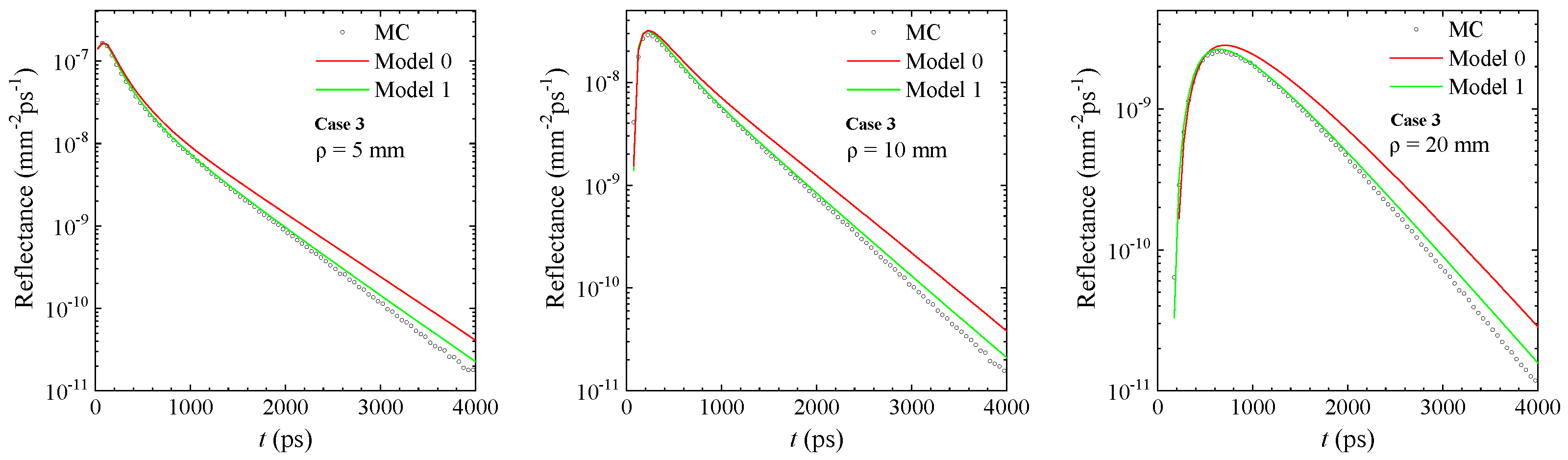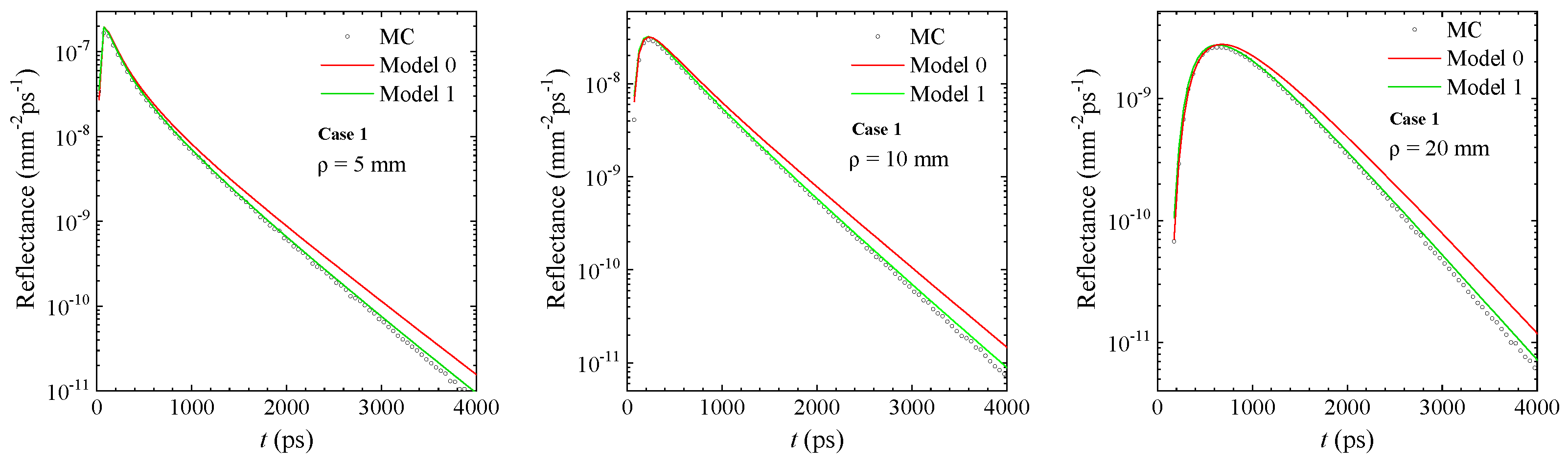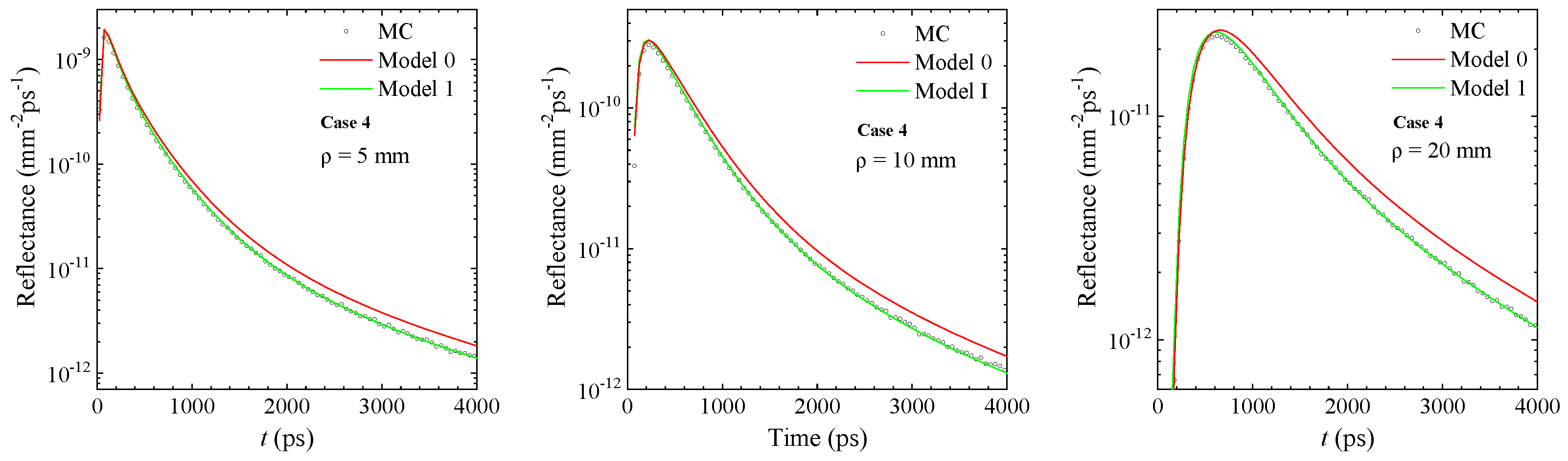 with A being a coefficient related to the Fresnel reflection coefficient [11,23]. Alternatively, can also be calculated by Fick’s law [11,23]. Actually, there are only slight differences between the two ways of calculating the photon flux [11,21], which are of little interest in this context; therefore, in this work, we used Equation (6). The superiority of “Model 1” over “Model 0” is shown through a comparison with the results of the MC simulations in the next section.