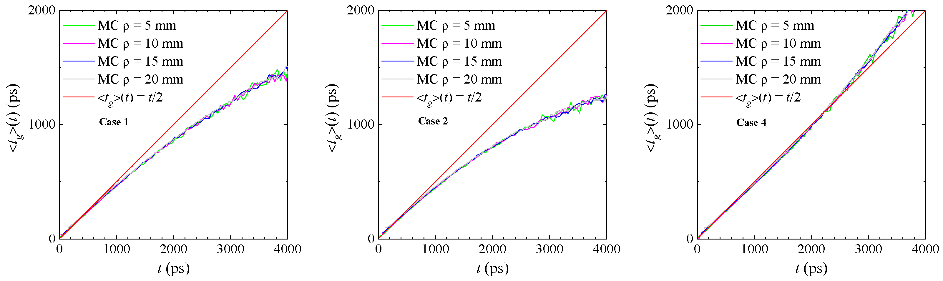 To better understand the validity of the heuristic approximation underlying “Model 1”, in Figure 6, by means of MC simulations, the average generation time of the emitted Raman photons is plotted as a function of time, along with the behavior hypothesized by the model for Cases 1, 2 and 4. The figure highlights that the heuristic hypothesis of “Model 1” holds exactly at early times, while at later times, a clear deviation emerges between the expected behavior and the actual behavior from the MC simulations.
