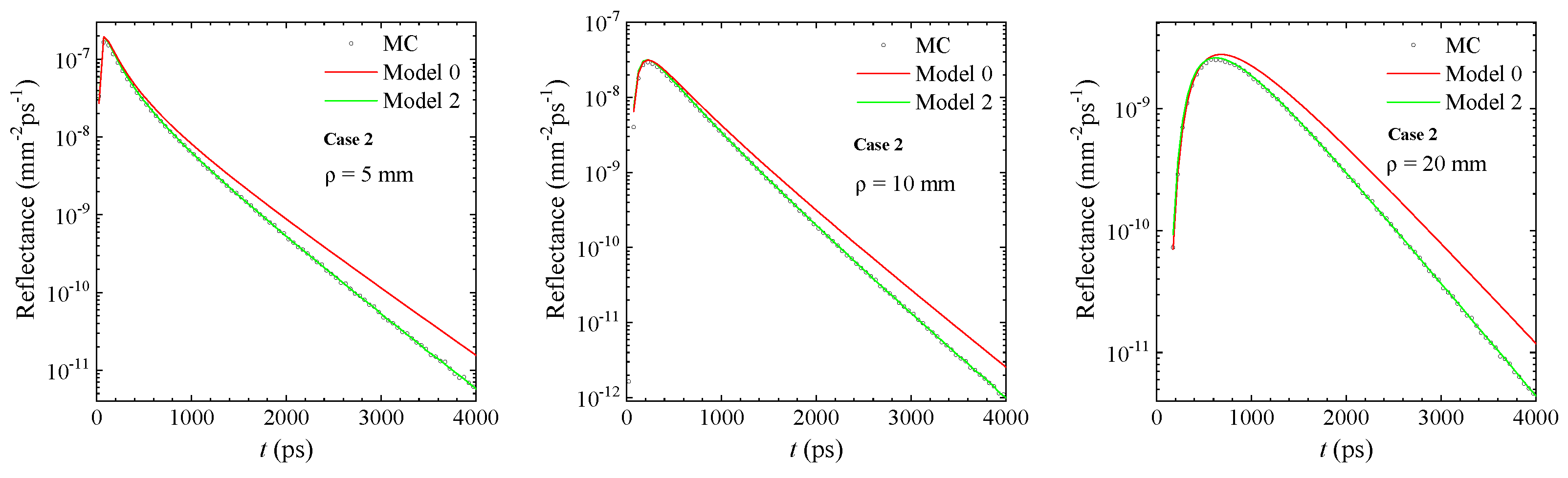 Comparison between models and MC results: Case 3. This case aims to test the model when , typical for instances of thorax in the lungs [25]. Other representative cases of this situation can also be found in breast and muscle tissue [12] when the analysis is performed at low wavelengths (lower than 700 nm).